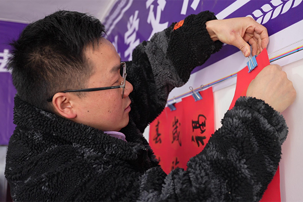 图为龚朝伟正在将写好的春联挂起来供村民挑选
